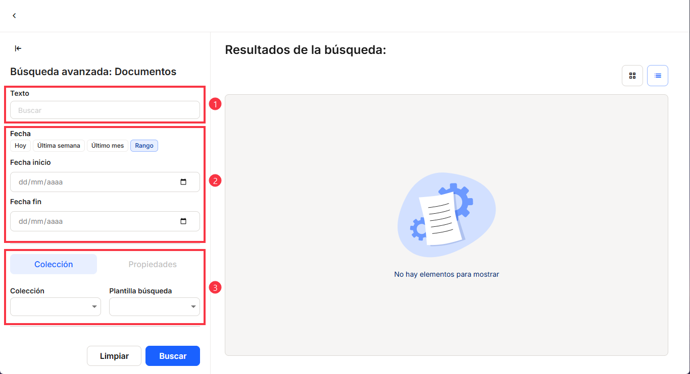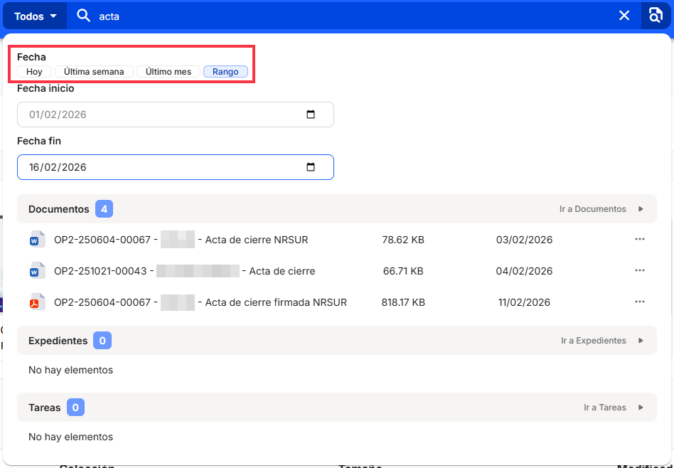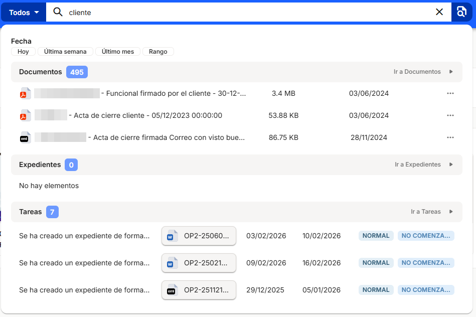 This search allows users to enter search terms in a single field and obtain results based on matches in the full text of documents and their names, applying relevance criteria (e.g., appearance in title, modification date, user who registered the document, etc.), without requiring the prior definition of structured filters.