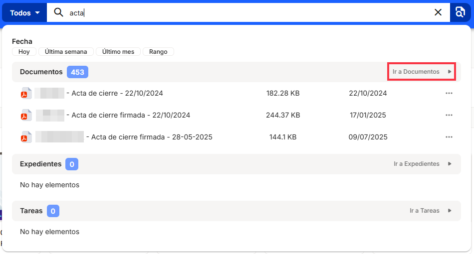 When you perform the search, a summary will be displayed with the three most relevant items for each element, unless you have previously selected only one. If you want to see a table with the complete set of items found, you can do so from the "Go to Documents," "Go to Files," or "Go to Tasks" option, as appropriate: