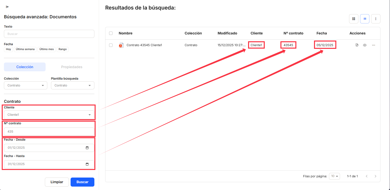 If we want to search for a date-type property, the system automatically offers us two fields: From and To. This allows us to search within a date range that includes the documents to be retrieved.