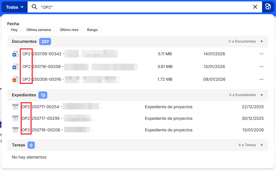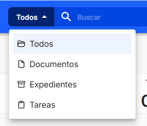 By default, the drop-down menu to the left of the search box is set to search all elements of the tool: documents, files, and tasks. In the case of advanced search, if we leave that option selected, it will take us to the advanced document search panel. If we want to search in a specific entity, we can expand the menu and select the option we want.