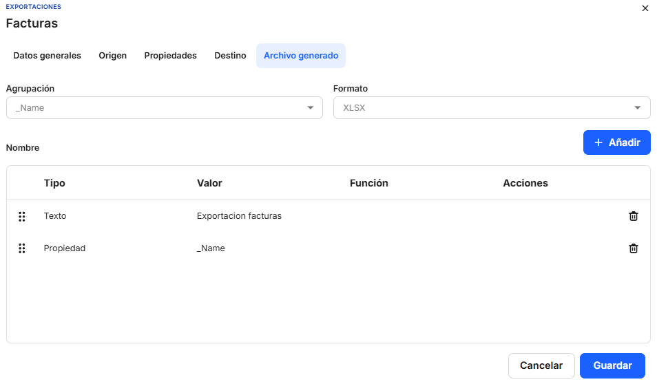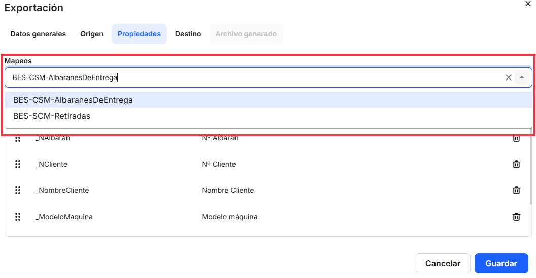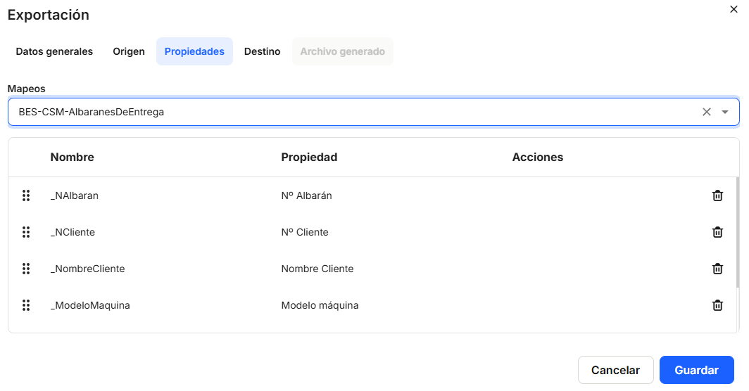Once a"Mapping" has been selected, the table with the list of "Properties" of the selected mapping will be displayed. Once the properties are shown, the system allows moving the order of the properties shown here, so that when the export file is generated, these properties will be shown as they are set. This table shows the "Name" and "Actions" columns with direct access to the delete option.