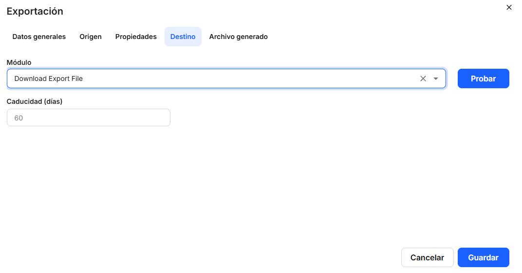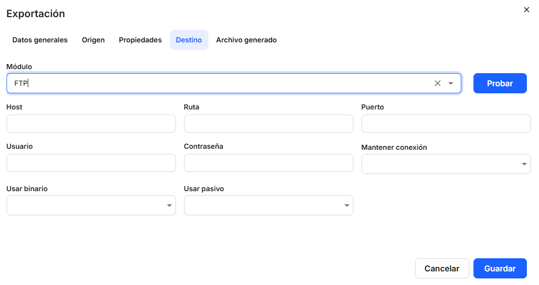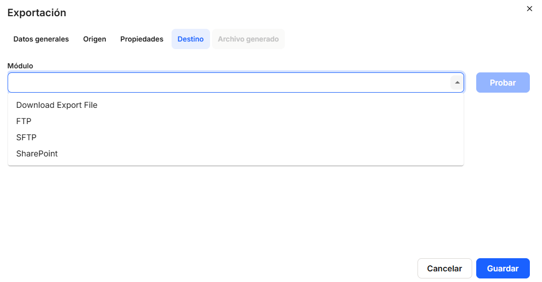 We also need to configure in the window that is displayed, and not necessarily in this order, the"Destination" tab,"Modules" (mandatory), where you must choose one of the options offered by the system, which will be offered by clicking on the button offered by the drop-down list or by clicking on the box. There are three options for obtaining the export file and the repository location,"Download Export File","FTP" and"SFTP". Depending on the option chosen, different data will need to be filled in, so that the file can be exported in the chosen format.