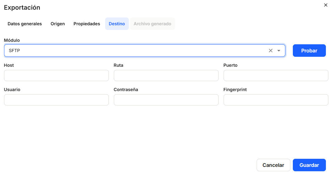 In the"SFTP" option, the system needs to specify a series of data such as"Module","Host","Path". "Port","User","Password","Fingerprint".