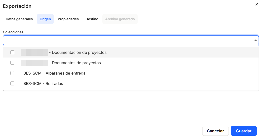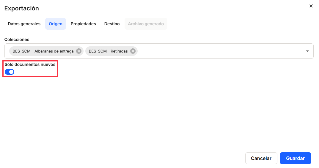 To do this, we need to configure the window that appears, not necessarily in this order, the "Source" tab, where you must enter "Collections" (mandatory), where you must select one or more of those registered in the system, which will be offered by clicking on the button that provides the drop-down list or by clicking on the box. Using theswitch, you can indicate whether you want this export to affectall documents or only new documents, provided that they meet the other conditions that are configured. A new document is one that has been registered in the system after the last execution of this export.