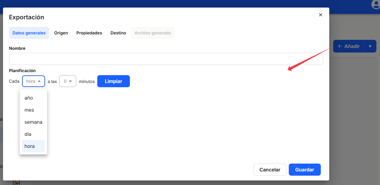 To do this, we need to configure in the window that appears, and not necessarily in this order, the"General data" section, the"Name" (which must be filled in) and"Schedule" (where the periodicity for the execution of the data export process will be established). With the "Clear" button you can delete any established time schedule.